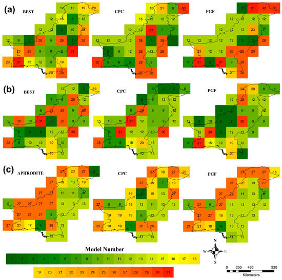 The geographical distribution of best performing GCMs in simulating: (a) maximum temperature; (b) minimum temperature; and (c) precipitation over Pakistan for different gridded datasets. The number in the figure represent the GCM as mentioned in Table 2.