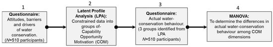 This study seeks to adopt a profiling approach to understand barriers and drivers influencing sustainable household water-conservation behavior based on the COM-B framework. Individual behavioral conditions—COM-B dimensions—have been found to influence sustainable behavior [23]. The aim of this study is to classify barriers to, and drivers of, household water conservation using a profiling approach, and link these barriers and drivers to appropriate behavior conditions for effective water-conservation intervention strategies based on the COM-B dimensions.