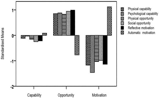The 1- through 3-profile solutions that emerged corresponded with the COM-B dimensions (Figure 2). The profiles showed a unique behavior condition for household water-conservation behavior. Profile 1 comprised 35.8% of respondents (n = 189) who were labelled as being capable (capability) about water-conservation behavior (Figure 2). On average, the capability group reported moderate social opportunity barriers to water-conservation behavior, very low levels of physical and psychological capabilities, and low levels of reflective motivation regarding water conservation and considered its impacts to be significant. Except for automatic motivation toward water-conservation behavior (which was the most positive across the profiles), mean scores on all psycho-social mechanisms were below the sample average.