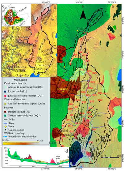 Simplified geological map of the Bilate river basin with sampling sites (a), modified from [28,30]. Inset map shows topography (b), location of the study area, (c) cross section showing the lithologic variation for A–B(d). Note; the light shaded area in figure (b) shows the highland and escarpment. B1–B42 in figure (a) referred to sample code (see Supplementary Materials).