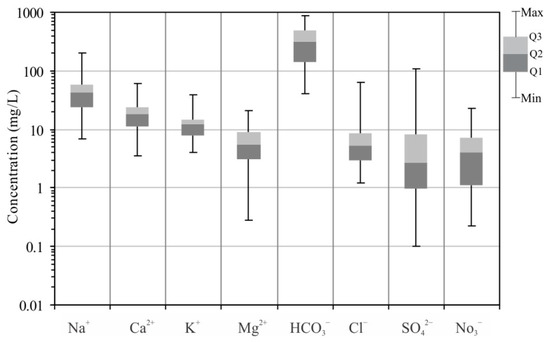 Box and whisker showing variability of chemical composition of the groundwater. Q1, Q2 and Q3 represent the first, the second and the third quartile, respectively.