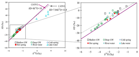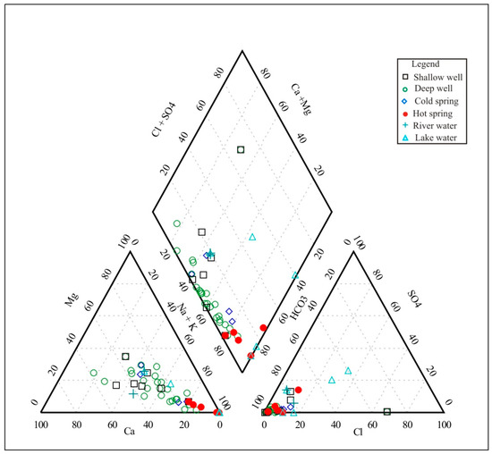 This study is based on water sample analysis together with the utilization of existing geological and hydrogeological information. Campaign for water sampling was undertaken through the area for hydrochemical and isotope analysis. The selection of the sampling locations was planned to take into consideration the representative area of the basin and the presence of complex system where cold water and thermal springs are found together. Forty-two water samples were collected in Bilattie river basin in May 2016 and the sampling location is shown on Figure 1. Among them, 6 samples were taken from shallow wells (10–60 m), 23 samples from deep wells (60–360 m), 4 samples were cold spring waters, 3 samples were hot spring waters, 2 samples were river water and 4 samples were lake water. Before sampling, the wells were pumped to remove the stored water in the well and ensure sampling of primary groundwater. Separate samples were picked for the analysis of isotopes and major ions. Samples were stored in new 100 mL polyethylene bottles for major ions and 100 mL glass bottle for δ18O and δD analysis, respectively. Water temperature (T), pH and EC were measured in situ using a portable Multi-functional water quality analyzer (Multi 3430) (WTW a xylem brand, Weilheim, Germany) that was calibrated before use. Major ions (Ca2+, Mg2+, Na+, K+, SO42−, Cl−, F− and NO3−) concentrations were measured with ion chromatography (Dionex Dx-120) (Thermo Fisher Scientific, Washington, DC, USA). Alkalinity was measured on the sampling day by Gran titration using 0.05 M HCl, while SiO2 concentration was determined using colorimetry. Stable isotopic compositions of water (δ18O and δD) were measured with a Finnigan MAT 253 mass spectrometer (Scientific Instrument Services, INC, New Jersey, NJ, USA). Water samples were equilibrated with CO2 for oxygen isotopic analysis and the Cd-reduction method was used to produce hydrogen gas for deuterium analysis. The δ notation was (VSMOW) used to report the analyzed water isotopes. The analysis was carried out at the State Key Laboratory of Geology and Geophysics, Chinese Academy of Sciences.