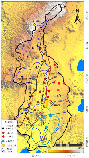- Furi, W.; Razack, M.; Abiye, T.A.; Ayenew, T.; Legesse, D. Fluoride enrichment mechanism and geospatial distribution in the volcanic aquifers of the Middle Awash basin, Northern Main Ethiopian Rift. J. Afr. Earth. Sci. 2011, 60, 315–327. [Google Scholar] [CrossRef]