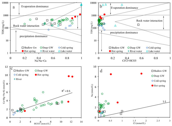 Plot of TDS versus the weight ratios of Na+/(Na+ + Ca2+) (a), the weight ratios of Cl−/(Cl− + HCO3−) (b) Gibbs [56], Relationship between major cations species and (HCO3−) (c), plot of Na+ versus Cl− (d).