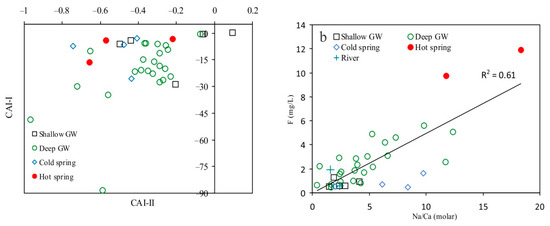 (a) plot of CAI-II vs. CAI-I of groundwater samples from the Bilattie River Basin [58] and (b) plot of F− vs. Na/Ca ratio.