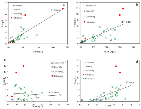 (a) Plot of Na+ vs. F−, (b) HCO3− vs. F−, (c) Ca2+ vs. F− and (d) F− vs. pH.