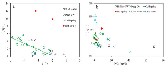 (a) Plot of δ18O vs. F− and (b) NO3− vs. F−.