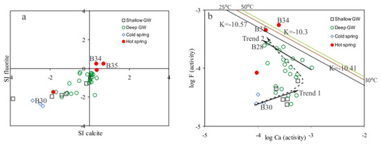 where, SI = saturation index, IAP = ion activity product of the dissociated chemical species in solution, Ksp = equilibrium solubility product for the chemical involved at the sample temperature. In this study, mineral saturation indices were calculated for all groundwater samples using the observed temperature and pH condition. The line of solubility product (K) used in the activity-activity diagram was constructed by using and the value of solubility product (Kfluorite) at 25 °C was taken from [46] and (Kfluorite) at 30 °C and 50 °C was taken from Reference [47].