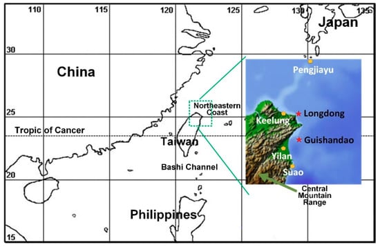 Taiwan is located at the border of the tropical and subtropical regions of the Pacific Ocean, where typhoons often occur during summer and autumn. Most typhoons gradually form above the sea surface southeast of Taiwan and produce torrential rains and strong winds that provide considerable water resources but also cause countrywide disasters [1]. When typhoons approach Taiwan from the Pacific Ocean, the northeastern sea and coastal area (Figure 1) are the first to be threatened. Because violent storms strike the sea surface with extreme wind speed that persists for a long duration, the resultant waves exhibit long wave periods and great wave heights [2]. Moreover, the topography of seabed may cause wave height to increase to a severely dangerous extent near the shore; for example, seawater intrusion may occur in lowland areas and anchored fishing boats may be capsized or dismantled because of the sudden rise of the waves or a fierce wave impact.