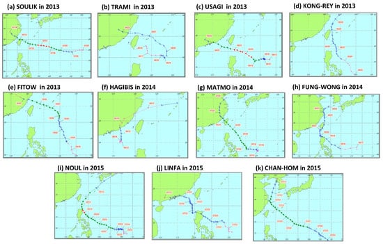 Paths of the 11 typhoons in the testing set: (a) Soulik in 2013; (b) Trami in 2013; (c) Kong-Rey in 2013; (d) Usagi in 2013; (e) Fitow in 2013; (f) Hagibis in 2014; (g) Matmo in 2014; (h) Fung-Wong in 2014; (i) Noul in 2015; (j) Linfa in 2015; and (k) Chan-Hom in 2015.