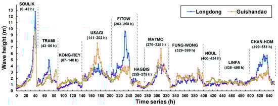 Among the typhoons for which the recorded wave height at Longdong was higher than that at Guishandao, typhoon Soulik is discussed first in this section. Typhoon Soulik was classified as a typhoon of intense intensity—an intensity level at which the wind intensity is greater than 51.0 m/s, as defined by the CWB—and the records indicate that the lowest pressure recorded at its center was 925 hPa, the maximum wind speed close to its center was 51 m/s, and the maximum instantaneous wind speed was 72 m/s. The path of Soulik was a generally westward path from east to west (Figure 2a), and the typhoon made landfall on Taiwan after passing through the Longdong and Guishandao buoys. Consequently, it had a considerable effect on both buoys and caused severe wind waves that resulted in wave height records that were notably higher than during the other typhoons. Typhoon Fitow was classified as a typhoon of moderate intensity—an intensity level at which the wind intensity ranges from 32.7 to 50.9 m/s, as defined by the CWB—and the records indicated its lowest pressure at center was 960 hPa, its maximum wind speed close to the center was 38 m/s, and its maximum instantaneous wind speed was 54 m/s. Although typhoon Fitow caused a remarkable wave height at Longdong, the recorded wave height at Guishandao was only 3.92 m. The difference between the records of the two buoys was as much as 5.68 m. As depicted in Figure 2e, the path of typhoon Fitow went from east to west and passed through the border of the research area without making landfall on Taiwan. Nevertheless, this typhoon caused remarkable wave heights at the Longdong buoy. However, the Guishandao buoy recorded less remarkable wave heights, which might have resulted from the fact that when the periphery of the typhoon touched the landmass of Taiwan, its structure was damaged and it became less powerful. Other typhoons with similar paths such as typhoons Trami (Figure 2b) and Chan-Hom (Figure 2k) also resulted in similar wave records.
