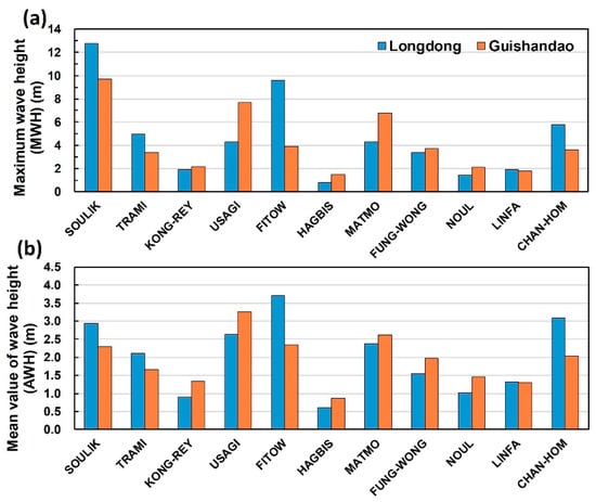 Figure 3 presents the observation record of the significant wave height of all the typhoons in the testing set. The observed wave heights recorded by the Longdong and Guishandao buoys are both present to facilitate the comparison of wave height changes during the same typhoon. According to Figure 3, the wave height varied considerably during typhoons Soulik, Usagi, Fitow, and Matmo. Figure 4 presents the maximum wave height (shorten as MWH) and mean value of the wave height (AWH) of typhoons in the testing set to compare the wave heights of said typhoons. Here, the AWH is computed by averaging the measurements from the individual typhoon. The following observations can be made according to Figure 4: (1) The MWH recorded at Longdong was 12.79 m during typhoon Soulik and the maximal AWH was 3.71 m during typhoon Fitow, and at Guishandao, the MWH of 9.72 m was also recorded during typhoon Soulik, but the maximal AWH of 3.27 m was recorded during typhoon Usagi. (2) The highest MWH values were both recorded during typhoon Soulik, and the recorded wave height at Longdong was 3.07 m higher than that at Guishandao.