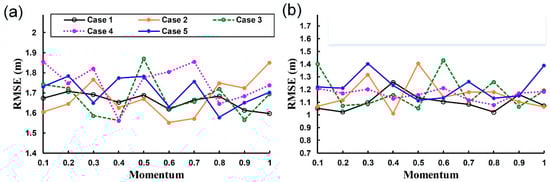 Momentum is a variable that affects the weight of forward input. The introduction of the momentum term is used to accelerate the learning process by triggering the weight changes to continue in the same direction with larger steps. Furthermore, the momentum term prevents the learning process from settling in a local minimum. Because the momentum parameter ranged between 0 and 1, this study conducted a test on this parameter and set the interval at 0.1. This parameter was then substituted into the five cases described in Section 3.3.1 and the RMSE between the prediction outcome and observed wave height was calculated. Figure 5 presents the analyses for both the Longdong and Guishandao buoys using the validation set. With respect to the Longdong buoy, when the momentum was 1.0, 0.6, 0.4, 0.4, and 0.8 for Cases 1 to 5, minimal RMSE values of 1.597 m, 1.552 m, 1.562 m, 1.564 m, and 1.578 m were obtained, respectively. For the Guishandao buoy, Cases 1 to 5 obtained minimal RMSE values of 1.023 m, 1.011 m, 1.053 m, 1.080 m, and 1.115 m for momenta of 0.8, 0.4, 0.5, 0.8, and 0.5, respectively. According to these outcomes, applying Case 2 with a momentum of 0.6 would attain the optimal solution for the Longdong buoy, whereas applying Case 2 with a momentum of 0.4 would attain the optimal solution for the Guishandao buoy.