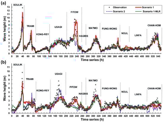 Figure 6 presents the prediction outcomes of both buoys for all the typhoons in the testing set with a lead time of 1 h; the black-edged circles represent the observed data, solid red lines represent Scenario 1, and blue dotted lines represent Scenario 2. The figure indicates that the results of Scenario 1 were closer to the observed data than those of Scenario 2. Scenario 2 notably underestimated wave height for various typhoons; for example, data for typhoons Soulik and Fitow at Longdong and typhoons Soulik, Fitow, and Matmo at Guishandao. Scenario 1 achieved a satisfactory level of performance for Longdong, but underestimated the wave height for typhoons Usagi and Matmo at Guishandao. Figure 7a,c depicts the distribution of observation values and prediction values, and the results indicate the following: (1) the CE of Scenario 1 had stronger agreement than that of Scenario 2 at both Longdong and Guishandao, which means that Scenario 1 had better fitting results; however, the CE of Scenario 1 at Guishandao was only slightly higher than that of Scenario 2; (2) in Scenario 1, the gradients were 0.8996 and 0.5829 for the Longdong and Guishandao buoys, respectively, which means that the prediction outcomes for Longdong presented less underestimation for wave height than Guishandao.