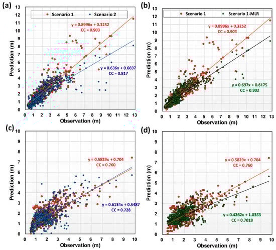 To compare the accuracy achieved using ANNs of Scenario 1, a traditional multiple linear regression (MLR) model (namely, Scenario 1-MLR) was applied as a benchmark. In Figure 6, the prediction results obtained using the ANN-based Scenario 1 are satisfactorily consistent with the observed data compared to Scenario 1-MLR. Moreover, the results in Figure 7b,d show that the slopes calculated are greater in the case of Scenario 1 than in the case of Scenario 1-MLR, indicating that the estimates obtained using the ANN models were closer to the observed results than the estimates obtained using the MLR models.