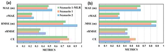 Figure 8 presents the calculation results of the prediction error using several evaluation indexes. The absolute errors (i.e., MAE an RMSE) of Scenario 1 were generally less than those of Scenario 1-MLR and Scenario 2 for both buoys, indicating that Scenario 1 had overall superior performance with respect to errors. With respect to relative errors (i.e., rMAE and rRMSE) and CE, Scenario 1 also outperformed Scenario 1-MLR and Scenario 2. Moreover, the CE of Scenario 1 was higher for the Longdong buoy (CE = 0.802) than for the Guishandao buoy (CE = 0.565).