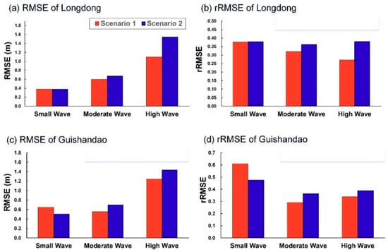- When the waves were classified as small, moderate, or high, the evaluation based on rRMSE yielded the following results. The values of rRMSE for each wave classification for Longdong in Scenario 1 progressively decreased in the order of small, moderate, and high waves; this phenomenon demonstrated that the Scenario 1 setting had the ability to reduce relative error when the wave height increased. The other finding demonstrated that the values of the relative error for small waves at Guishandao in Scenarios 1 and 2 were relatively higher at 0.610 and 0.476, respectively.