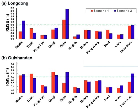 This section evaluates the error values for each typhoon in the testing set. Figure 10 presents the RMSE of each typhoon in the testing set for the Longdong buoy and Guishandao buoy. This figure also presents the prediction results of Scenarios 1 and 2. The results demonstrated that the typhoons with relatively high error values, indicated by an RMSE higher than 1, were typhoons Soulik (Scenario 2) and Fitow (Scenarios 1 and 2) at the Longdong buoy and typhoons Soulik (Scenarios 1 and 2), Trami (Scenario 1), Usagi (Scenarios 1 and 2), Fitow (Scenario 2), and Chan-Hom (Scenario 2) at the Guishandao buoy. Five typhoons had a high RMSE at Guishandao compared with two at Longdong, which suggested that wave height prediction at Guishandao might be more complex. This study determined several possible factors that may have added to the difficulty of wave prediction at Guishandao, resulting in a higher prediction error at Guishandao—the path of the typhoons, the location of the buoy, the geographical environment, and typhoon intensity.