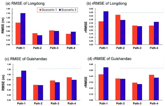 The values of RMSE (a,c) and rRMSE (b,d) for Longdong and Guishandao according to typhoon path.