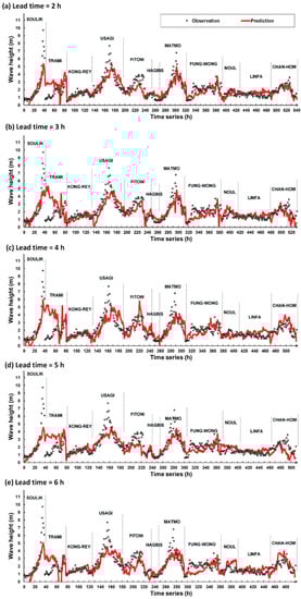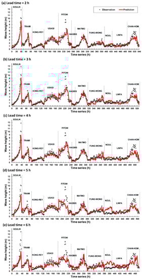 Wave height prediction of lead time = 2 to 6 h at Longdong buoy: (a) lead time = 2 h; (b) 3 h; (c) 4 h; (d) 5 h; and (e) 6 h.
