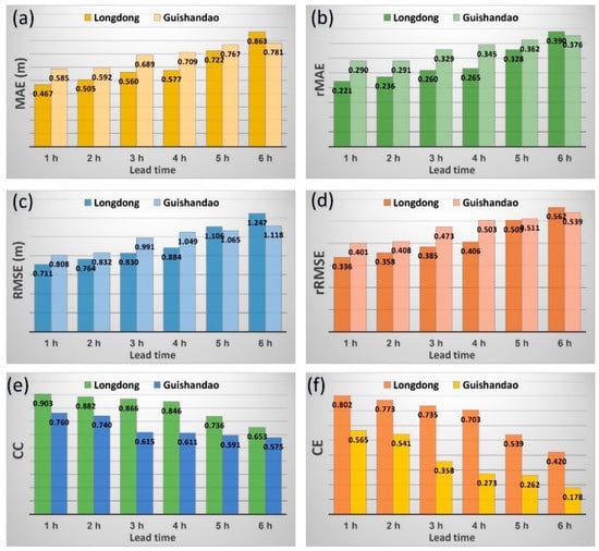 Figure 12 and Figure 13 present the wave height prediction results for the Longdong and Guishandao buoys with a lead time varying from 2 to 6 h. The results of a lead time of 1 h is presented in Figure 6. As the lead time lengthened, the prediction accuracy worsened. Figure 14 presents the calculation results of each evaluation index when lead time varied from 1 to 6 h; the results were used to determine the diffusion of prediction error. Figure 14a–d indicates that the errors at Longdong were lower than those at Guishandao when the lead time varied from 1 to 5 h, whereas at a lead time of 6 h, the error at Longdong surpassed that at Guishandao. However, at a lead time of 6 h, the absolute and relative errors for both buoys were considerably large, which diminished the reliability of prediction values. Generally, a reasonable threshold for the error item is set up to determine lead time length for wave height forecast in practice. For example, when the acceptable threshold for wave height prediction was set at rMAE = 0.3, the lead time for Longdong buoy was 4 h, whereas for Guishandao it was 2 h, as depicted in Figure 14b. Finally, both the CC (Figure 14e) and CE (Figure 14f) were higher at Longdong than at Guishandao at a lead time of from 1 to 6 h.