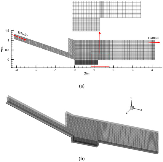 The computational domain and grid are shown in Figure 2 with the same dimensions as Figure 1. The longitudinal cross-section in Figure 2a is located at the center of Figure 2b. The grids in the stilling basin and tail water section were transited from coarse to fine from top to bottom, of which size is 2–3 cm, and the total grids of the model is 272,000.