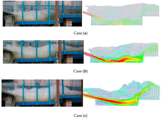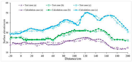 The calculation results of the large eddy simulation were compared with the test results of three cases based on the Froude number (Fr) at the inlet of stilling basin and the depth of SBSWC, which are (a) Fr = 6.92, d = 20 cm, (b) Fr =7.64, d = 15 cm, and (c) Fr = 9.25, d = 25 cm, respectively.