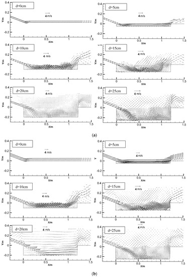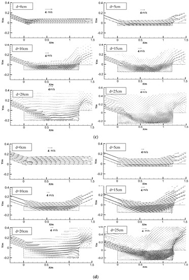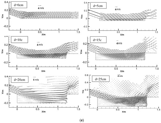 It is seen that the regimes and velocity distribution are different in the stilling basins for different depths with the same Froude number and with different Froude number but same depth. For the same Froude number, if the depth is not enough, no hydraulic jump takes place in the basin, and the regime of jump gets more complete as the depth increases; for example, when the depth of stilling basin is 0 cm or 5 cm, there is no hydraulic jump in the stilling basin; when the depth of stilling basin is 10 cm, 15 cm, 20 cm, or 25 cm, there is a hydraulic jump in the stilling basin. This pattern holds for all the groups (a)–(e) with different Froude numbers. For different Froude numbers, the depth required to form a complete hydraulic jump is different. For example, a complete hydraulic jump occurred in the depth of 15 cm, 20 cm, and 25 cm in the stilling basin when the Froude numbers are 7.64 and 6.92. In case that the Froude number is 8.05 and 9.25, the complete hydraulic jump occurred in the depth of 20 and 25 cm in the stilling basin. While in the case of Froude number 11.24, the complete hydraulic jump occurs in the depth of 25 cm in the stilling basin.