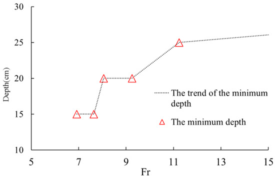 The regimes of hydraulic jumps in the stilling basin at different conditions were presented in Figure 6. Since it was not possible to calculate every depth as a calculated working condition, the same six depths were selected for each Froude number, which were 0, 5, 10, 15, 20, and 25 cm respectively. Therefore, the calculated best depth in each corresponding Froude has an error of ±2.5 cm.