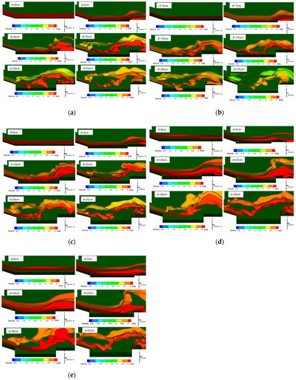 Flow regimes and velocity distribution at axial plane. (a) Fr = 6.92; (b) Fr = 7.64; (c) Fr = 8.05; (d) Fr = 9.25; (e) Fr = 11.24. Fr: Froude number.