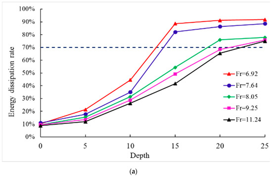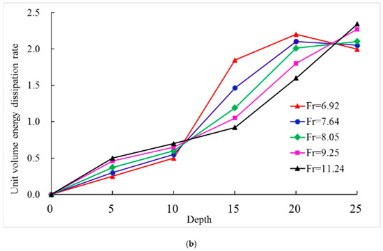 Generally speaking, the total energy dissipation (e) increases rapidly with the depth of the basin and changes little after reaching a certain value with the depth (Figure 9a); whereas, when the Froude number is smaller, the unit volume energy dissipation rate goes high with the increase of the depth first, and then drops down after reaching the maximum value, which means some of the water body does not involve the energy dissipation (Figure 9b); when the Froude number is larger, it goes higher with the increase of the depth. It also shows that the total energy dissipation reaches the maximum but the unit volume energy dissipation rate may not reach its maximum value, which indicates the depth of the basin is not good enough for the hydraulic jump; for example, the unit volume energy dissipation rate keep increasing with Froude number in the cases of Froude numbers equal to 9.25 and 11.24 which means the depth of 25 cm is sufficient for them getting to the maximum unit volume energy dissipation rates in the study.