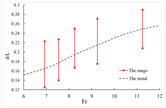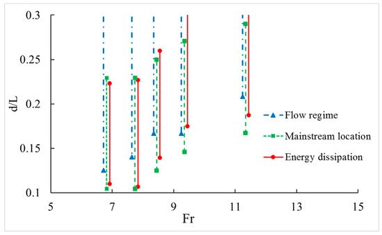 The overlap of all the three ranges for the same Froude number represented that the three standards were met in this integral (the integral between the maximum of the 3 minimums and the minimum of the maximums) and its mean is taken as the best depth of the stilling basin with shallow-water cushion shown in Figure 11 where the dimensionless depth (d/L, the depth over the length of the stilling basin) was adopted. It indicates that the ranges of the best depth are large for some cases while small for some other cases and that the best depth of the stilling basin increases with the increase of the Froude number.