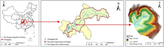 In this study, 13-year precipitation data were collected from Fuling District Bureau of Meteorology, Chongqing, China. Sources of data were categorized and listed in Table 1. All of the raster data were used in a spatial resolution of 2.5 m in the ArcGIS 10.2 software. Note that MODIS Normalized Difference Vegetation Index (NDVI) dataset (United States Geological Survey, Reston, Virginia, VA, USA) needs to be converted to the same resolution of 2.5 m for further spatial analyses (Detailed information in Section 3.1.4). Moreover, the land use data in this study were derived through digitizing the 1:1000 land use patterns mapped based on a field survey [41].