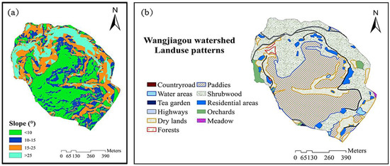 The slope (a) and land use patterns (b) in the Wangjiagou agricultural watershed.
