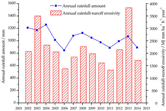 Annual rainfall erosivity values (Table S2) showed a significant temporal variation ranging from 1320.41 to 3829.42 MJ·mm·ha−1·h−1·year−1 from 2002 to 2014 (average of 2154.81 ± 741.52 MJ·mm·ha−1·h−1·year−1). The relationship between annual rainfall amount and rainfall erosivity was illustrated by Figure 3. Higher values of 3497.22 and 3829.42 MJ·mm·ha−1·h−1·year−1 were observed in 2003 and 2013. Even though the total annual precipitation amounts in these two years were comparable with those in other years, the occurrence of most rainfall (about 71% and 63% in 2003 and 2013) was concentrated in three months (from May to July), suggesting that rainfall intensity is probably a primary factor influencing R.