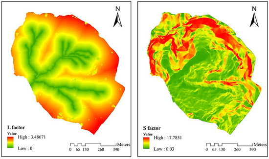 Topography factors (slope length factor and steepness factor ) were calculated through the algorithms mentioned above by using DEM as well as examining the interactions between topography and flow accumulation (Figure 4). The results showed that and factors ranged from 0 to 3.49 and from 0.03 to 17.79, respectively. Moreover, these two factors showed a similar distribution trend with an increased value appearing in the mountains and high elevation area, and decreased value presenting near the main drainage network. The average topographic factor of the Wangjiagou watershed was calculated to be 8.90 ± 7.88.