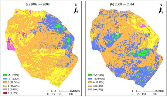 In order to reveal the spatial dynamics of soil erosion intensity, the spatial overlay analysis method was applied to analyze the space transformation of soil erosion intensity in the study area at two time intervals (from 2002 to 2008 and from 2008 to 2014) (Figure 5). Specifically, Figure 5a indicates that the area with unchanged soil erosion intensity level (0) accounting for 58.06% of the total study area from 2002 to 2008, mainly distributed in a low altitude area and the drainage network area. The percentages of the area receiving a grade reduction (−1) and a grade increase (1) are 12.42% (mainly distributed in the high altitude area in the northeast region) and 25.72% (in the central and southeast part of the study area with sharp slopes), respectively. However, only 2.45%, 0.15%, and 1.20% of the study area received a two and three grades increase (2 and 3) and two grades reduction (−2). Note that these areas with a two or three grades increase from 2002 to 2008 were mainly distributed in orchards. It can be explained that orchards were largely developed in those years accompanying with adjustment of agricultural industrial structure in TGRR. Soil erosion in orchards became serious due to the poor soil conditions of newly constructed slope orchards, a thin soil layer, and the large area of the idle land. As a result, it triggered double pressure for the ecosystem and agricultural sustainable development within this region [63]. From 2008 to 2014, the unchanged area (0) and the area with one grade reduction (−1) occupied a fairly large proportion (57.53% and 30.99%) of the whole area (as shown in Figure 5b), and most of the unchanged area is still mainly located in the drainage network area. While the area with −1 was much more than that between 2002 and 2008 and was primarily distributed in the southern part and the central part with sharp slopes. It was further considered that the implementation of integrative soil management practices from 2008 to 2009 was responsible for the large proportion of area with one grade reduction from 2008 to 2014. As for the area with one grade increase mainly distributed in the southern shrubwood, it may be attributed to the intensive human activities.