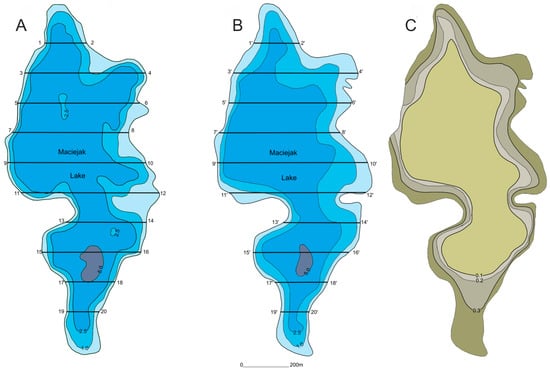 As part of the study, the modern bathymetric plans were compared with the plans prepared by the Stanislaw Sakowicz Inland Fisheries Institute in Olsztyn in the 1960s, in order to assess the changes that have occurred over the past 50 years. For this purpose, the depth of the lake was measured along designated latitudinal cross sections for the two time periods indicated above. A comparative analysis of the bathymetric plans from the two time periods provided a basis for plotting isolines (isopachs), which represent changes in the lake-bottom morphology. Differences between the plans were used for assessing the changes in the bathymetry of the lakes along specific profiles (Figure 1). Using the above-mentioned data, it was possible to determine the shallowing rate and extent in terms of sediment thickness and spatial distribution, assuming a linear process and erosional failure. Having calculated the total area enclosed by specific isopach lines, it was possible to estimate the percentage of the lake area subject to the shallowing process. For the purpose of simplifying the statistical analysis, the results obtained were split into two groups representing low (<0.2 m) and high (>0.2 m) thicknesses of accumulated sediment.