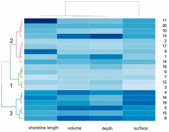 Correlation between the lakes studied with regard to their morphological parameters (heatmap) presented using a hierarchical tree diagram to show the three groups of lakes that are similar in terms of lake surface area, volume, depth, and length of the shoreline.