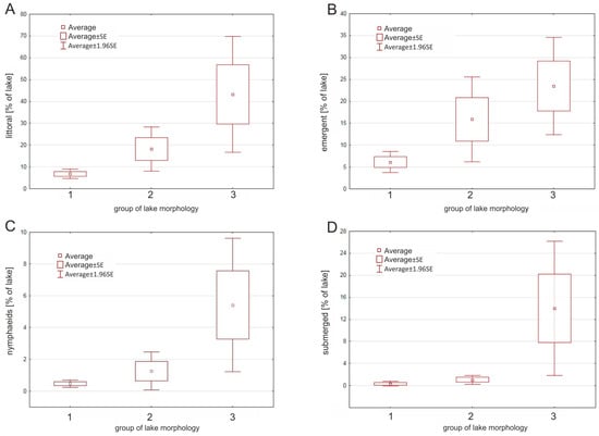The macrophyte analysis of the lakes showed that the different morphological groups varied in terms of vegetation (Figure 3). However, high variability of macrophyte coverage was detected both within and between groups. In Group 1, the macrophyte coverage was insignificant (8%) and dominated by emergent vegetation. In Group 2, the macrophyte coverage was smaller (18.2%) and dominated by helophytes (15.9%). The smallest reservoirs (Group 3) had the highest rate of macrophyte coverage (43.2% on average) and were dominated by emergent (23.5%) and submerged macrophytes (14.0%). The Kruskal–Wallis test showed significant differences between the three morphological groups of lakes only in terms of the littoral zone cover (F = 7.00; p = 0.030) and open water area (F = 7.10; p = 0.029). The differences between different groups of emergent (F = 5.89; p = 0.053) and submerged vegetation (F = 5.48; p = 0.064) were only marginally significant. However, a clear pattern emerged, in which the macrophyte coverage increased when the morphometric parameters of the lake decreased (Figure 3).