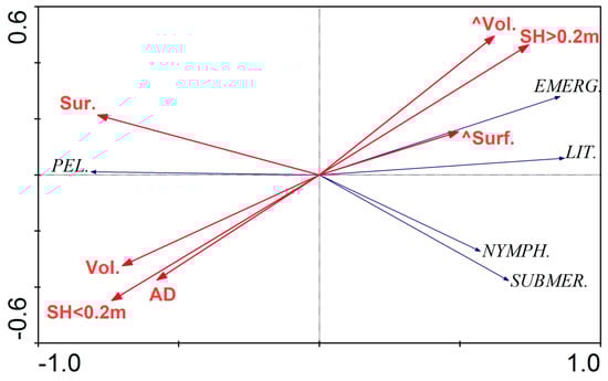 Ordination diagram (biplot) based on the Redundancy analyses (RDA) of macrophyte parameters and selected morphological parameters of the lakes under study. The length of the arrows representing some of the morphological variables emphasizes their significant impact on the distribution of macrophyte development. Abbreviations: SH < 0.2 m—shallowing rate lower than 0.2 m, SH > 0.2 m—shallowing rate higher than 0.2 m, AD—average depth, Vol.—volume, Surf.—surface area, ^Vol.—volume changes (1960–2015), ^Surf.—surface area changes (1960–2015), PEL.—pelagic, LIT.—littoral, EMERG.—emergent, NYMPH.—nymphaeids, SUBMER.—submerged.