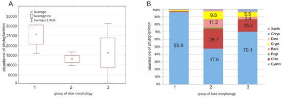 Abundance of phytoplankton (A) and percentage of different phytoplankton groups (B) within the morphological groups of lakes analyzed. Abbreviations: Bacil.—Bacillariophyceae, Chlo—Chlorophyta, Chrys—Chrysophyceae, Crypt.—Cryptophyceae, Cyano—Cyanobacteria, Dino—Dinophyta, Eugl.—Euglenophyta, Xanth—Xanthophyceae.