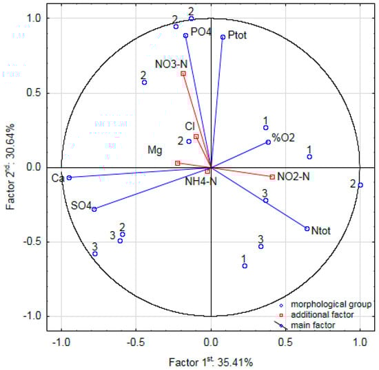 Principal Component Analysis of the measured physico-chemical parameters of the surface water in relation to the selected morphological groups. Abbreviations: Ntot—total nitrogen, NO2-N—nitrite, NO3-N—nitrate, NH4-N—ammonium, Ptot—total phosphorus, PO4—orthophosphate, SO4—sulphates, Ca—calcium, Mg—magnesium, Cl—chlorides, %O2—oxygen concentration.
