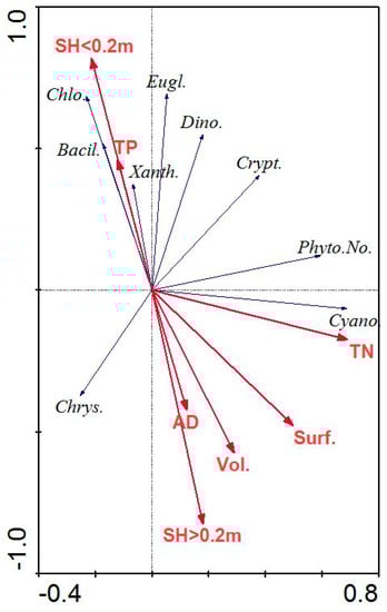 Ordination diagram (biplot) based on the RDA of phytoplankton parameters and selected morphological parameters of the lakes under study. Abbreviations: SH < 0.2 m—shallowing rate lower than 0.2 m, SH > 0.2 m—shallowing rate higher than 0.2 m, AD—average depth, Vol.—volume, Surf.—surface, TN—total nitrogen, TP—total phosphorus, Bacil.—Bacillariophyceae, Chlo—Chlorophyta, Chrys.—Chrysophytes, Crypt.—Cryptophyceae, Cyano—Cyanobacteria, Dino—Dinophyta, Eugl.—Euglenophyta, Xanth—Xanthophyceae, Phyto.No.—total number of phytoplankton individuals.