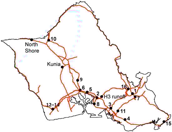 Selection of sampling sites for potential siting of infiltration trenches along highways and major roads on Oahu, HI. The numbers refer to sampling sites, 1: H3—Kamehameha interchange (IC), 2: H3—H1 IC, 3: Likelike—H1 IC, 4: H1—University Ave., 5: H1—Moanalua Rd., 6: H1—H2 IC, 7: Pali—Kamehameha Hwy., 8: H1—Kamehameha Hwy., 9: H2—Kauka Blvd., 10: Kamehameha Hwy. —Waialua Beach Rd., 11: Pali from Ahi Pl. to the tunnel, 12–14: H1—Kalaeloa Blvd., 3 points, 15: Sandy Beach Park, 16: Likelike—Kahekili Hwy. Two additional sites from which the soil columns used for the laboratory experiments (North Shore and Kunia) and the location where stormwater highway runoff (H3 runoff) was collected are also shown.
