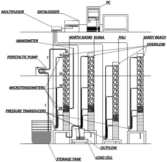The instrumentation included microtensiometers consisting of stainless steel cups (316L stainless steel, series 6500, Mott Corporation, Farmington, CT, USA) inserted into the gravel, sand, and soil at various levels to monitor soil water pressure heads in the composite columns. All of the tensiometers were connected to pressure transducers (236PC 15GW, Honeywell Microswitch, Columbus, OH, USA) and connected via multiplexor (AM 416 Relay Multiplexor, Campbell Scientific, Logan, UT, USA) to a data logger (CR10X, Campbell Scientific, Logan, UT, USA). The outflow was measured using buckets placed on load cells (GP 20K, A&D Weighing, Ann Arbor, MI, USA). The effluent was collected to monitor chemical parameters. The columns included overflow drains at the top to allow excess water to flow out thus maintaining a constant head at the top.