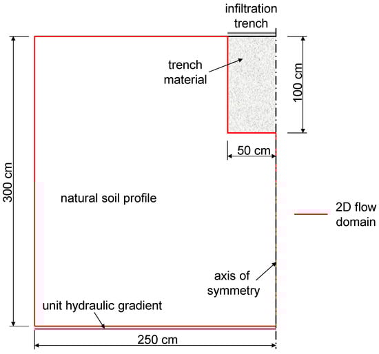 To evaluate infiltration capacity of trench sites, the two-dimensional model HYDRUS [] was used. HYDRUS model was previously applied for evaluation of the water flow regime in wastewater trench systems [,]. This process-oriented model is based on a numerical solution of Richards’ equation for soil water flow. In this study, we assumed a hypothetical gravel-filled linear trench 100 cm deep and 100 cm wide. Only half of the trench was considered in the numerical modeling since the center line of the trench is an axis of symmetry shortening the time needed to run the simulation. The domain was divided into 23,501 triangular finite elements. All two-dimensional simulations were based on unit length of the trench. The depth and width of the 2D simulated flow domain (the soil surrounding the trench) were 300 and 250 cm, respectively (Figure 3), representing a one cm thick vertical slice through the system. The dimensions of the flow domain were chosen to be large enough to meet the requirement that the lower and outer vertical boundaries do not affect the infiltration rate in the vicinity of the trench. Since the trenches are linear structures, a two-dimensional model can approximate the flow phenomenon adequately (a three-dimensional model is not required). In reality, the infiltration trench length can vary depending on site-specific conditions.