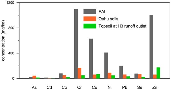 The results of our analysis of soil from sixteen selected sites show that all the soils contained As, Cd, Cr, Co, Cu, Ni, Pb, Se, and Zn at detectable concentrations (Figure 4). The elevated concentrations most likely resulted from accumulated road pollution. The concentration of Pb in the soil from the Pali—Kamehameha Hwy. (site no. 7) and the concentration of Cr and Ni in soil from the Kamehameha—Waialua IC (site no. 10) exceeded the Hawaii soil EALs. The median concentration of As in soils sampled along Oahu highways exceeded the soil EAL []. In Hawaii, low levels of arsenic are found naturally in native soils. The use of arsenic-based herbicides/pesticides on sugarcane fields took place in the past. It remains unclear if this historic use led to elevated soil concentrations of As along the highways. The topsoil sample from the H3 runoff outlet had a high concentration of Zn. Brakes, tires, and frames of vehicles are the main sources of Zn in urban runoff [].