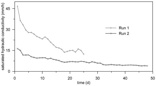 Results of the long-term clogging column experiments on Sandy Beach soil. A decrease of saturated hydraulic conductivity for the first run (Run 1) over 25 days and the second run (Run 2) over 48 days.