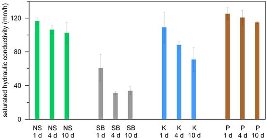 Average saturated hydraulic conductivity values during intermittent infiltration-outflow experiments in four different soil columns. The abbreviations represent columns from North Shore (NS), Sandy Beach (SB), Kunia (K), and Pali (P). The numbers below the columns indicate the time (days since start of the experiment) when the evaluation of the saturated hydraulic conductivity was performed. The error bars represent standard deviations.